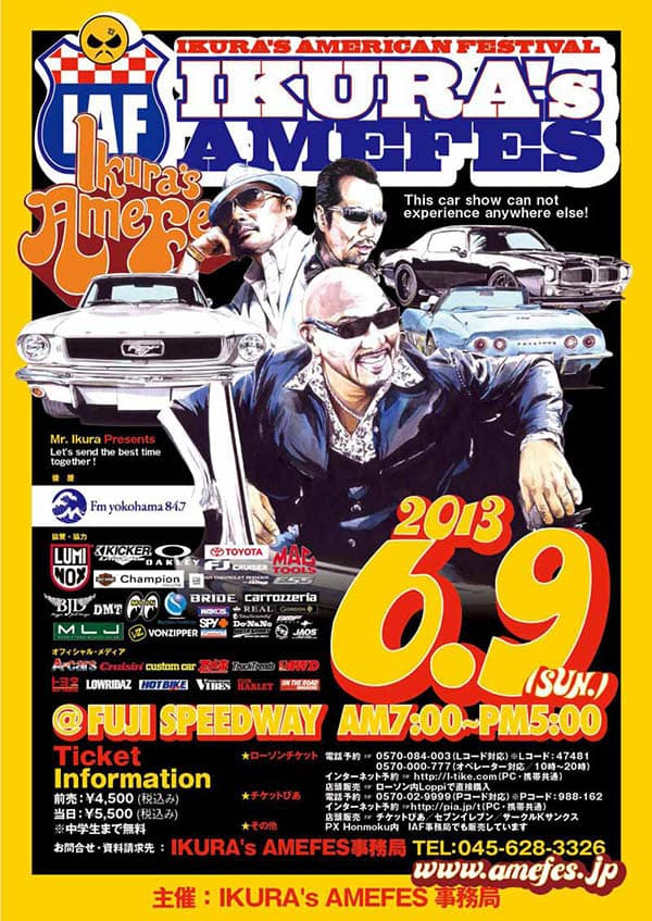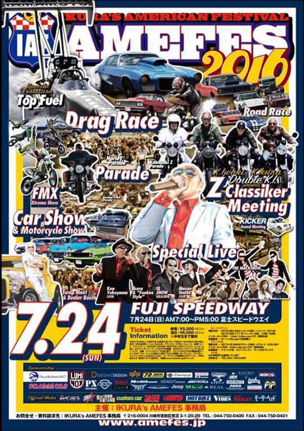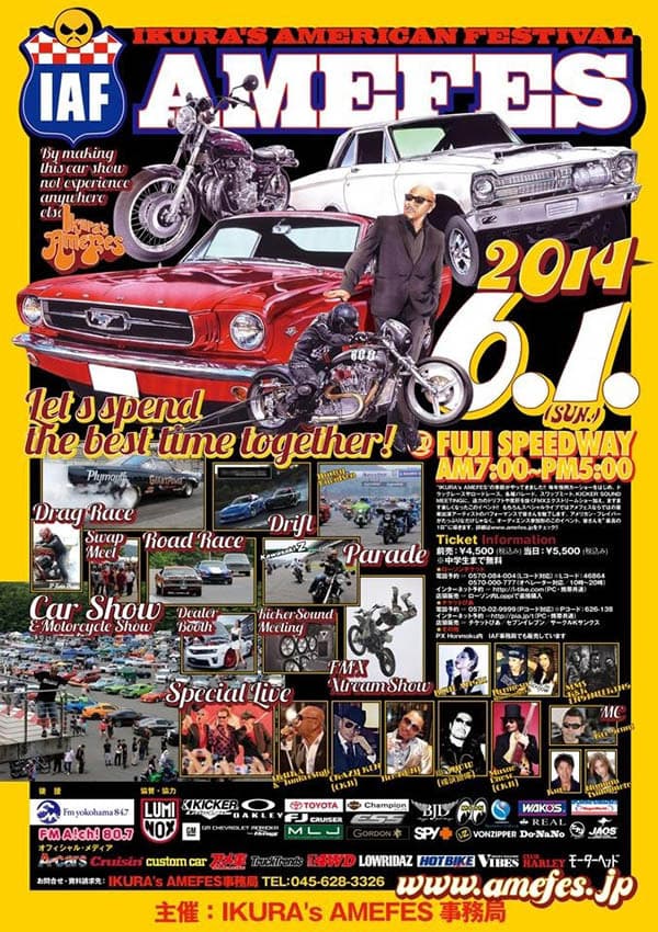 恒例カーショーをはじめ、ドラッグレースやロードレース、各種パレード、スワップミート、KICKER SOUND MEETING 、FMXエクストリームショーに加え、Zクラシッックカーミーティングの開催など、ますますグレードアップしたこのイベント!!スペシャルライブは勿論、AMEFES(アメフェス)ならではの豪華出演アーティストのパフォーマンスが皆さんを魅了します。アメリカン・フレイバーがたっぷりなだけじゃなく、オーディエンス参加形のこのイベント。今年も皆さんを”最高の1日”に導きます。アメリカのカッコイイ物や楽しみ方を凝縮したAMERICANFESTIVALそれが、IKURA's AMEFES(アメフェス)です。