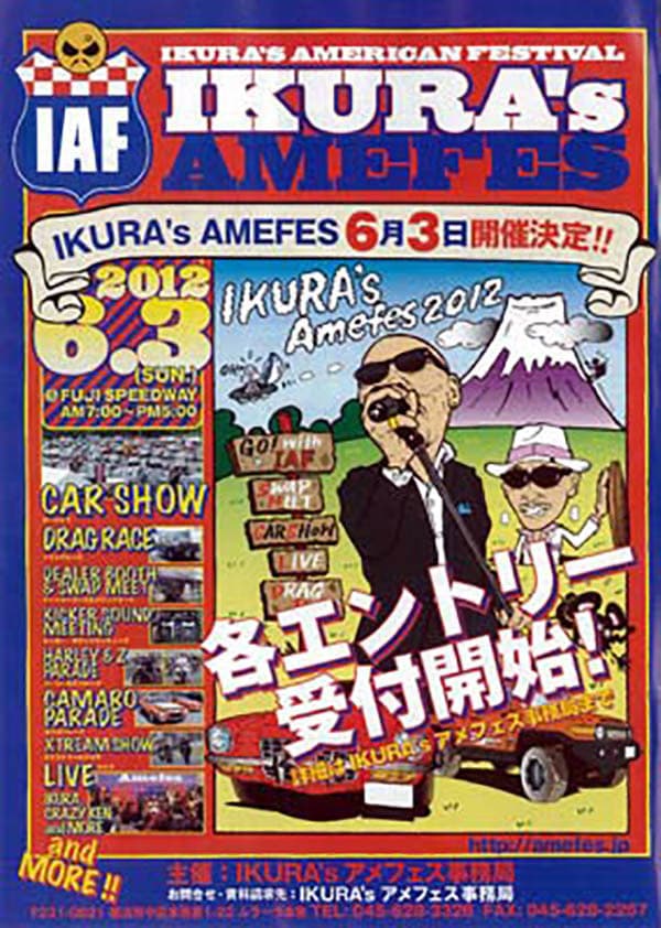 恒例カーショーをはじめ、ドラッグレースやロードレース、各種パレード、スワップミート、KICKER SOUND MEETING 、FMXエクストリームショーに加え、Zクラシッックカーミーティングの開催など、ますますグレードアップしたこのイベント!!スペシャルライブは勿論、AMEFES(アメフェス)ならではの豪華出演アーティストのパフォーマンスが皆さんを魅了します。アメリカン・フレイバーがたっぷりなだけじゃなく、オーディエンス参加形のこのイベント。今年も皆さんを”最高の1日”に導きます。アメリカのカッコイイ物や楽しみ方を凝縮したAMERICANFESTIVALそれが、IKURA's AMEFES(アメフェス)です。